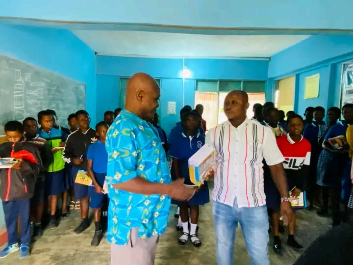 A member for I CARE GHANA and SOMUBI, a None Government Organization that aims at providing learning equipment for schools and students and also keeping our environment clean presents gifts of books and other learning materials to the students of Presbyterian Model School(PREMOS).
