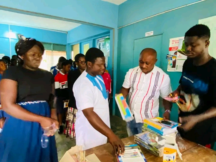 Visiting the school, He presents books, pencils and pen to the students and teachers and also promising to get the school some computers to foster the learning of Information and Communication Technology.